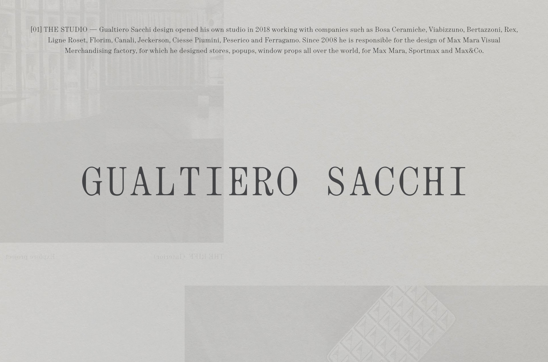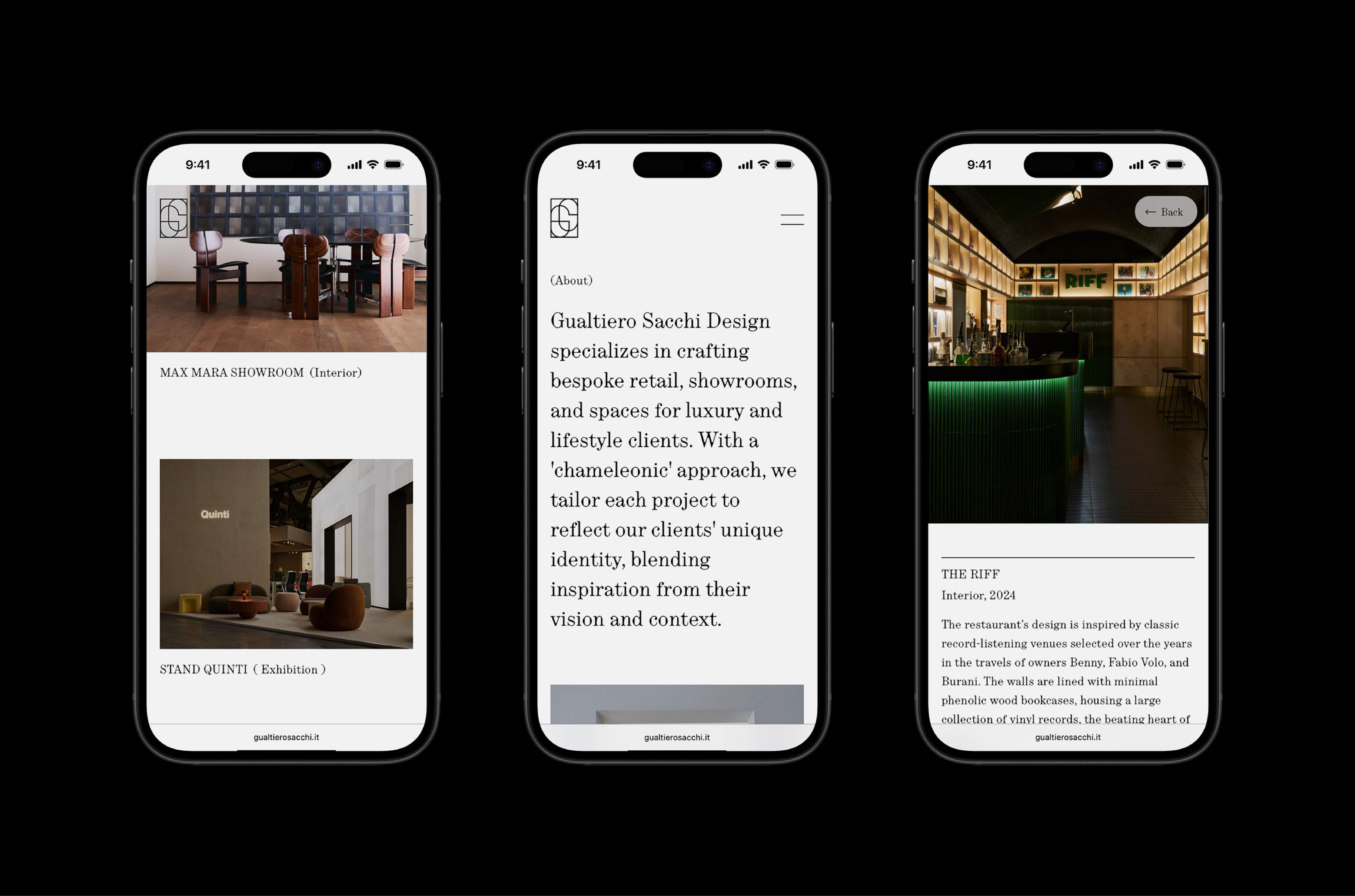 A branding and website project developed to reflect the refined aesthetic of Gualtiero Sacchi’s interior and retail design studio. The visual identity and digital presence were designed to be minimal yet expressive, with a focus on clarity, composition, and photography. The result is an elegant portfolio experience that highlights the studio’s work with intention and visual harmony.